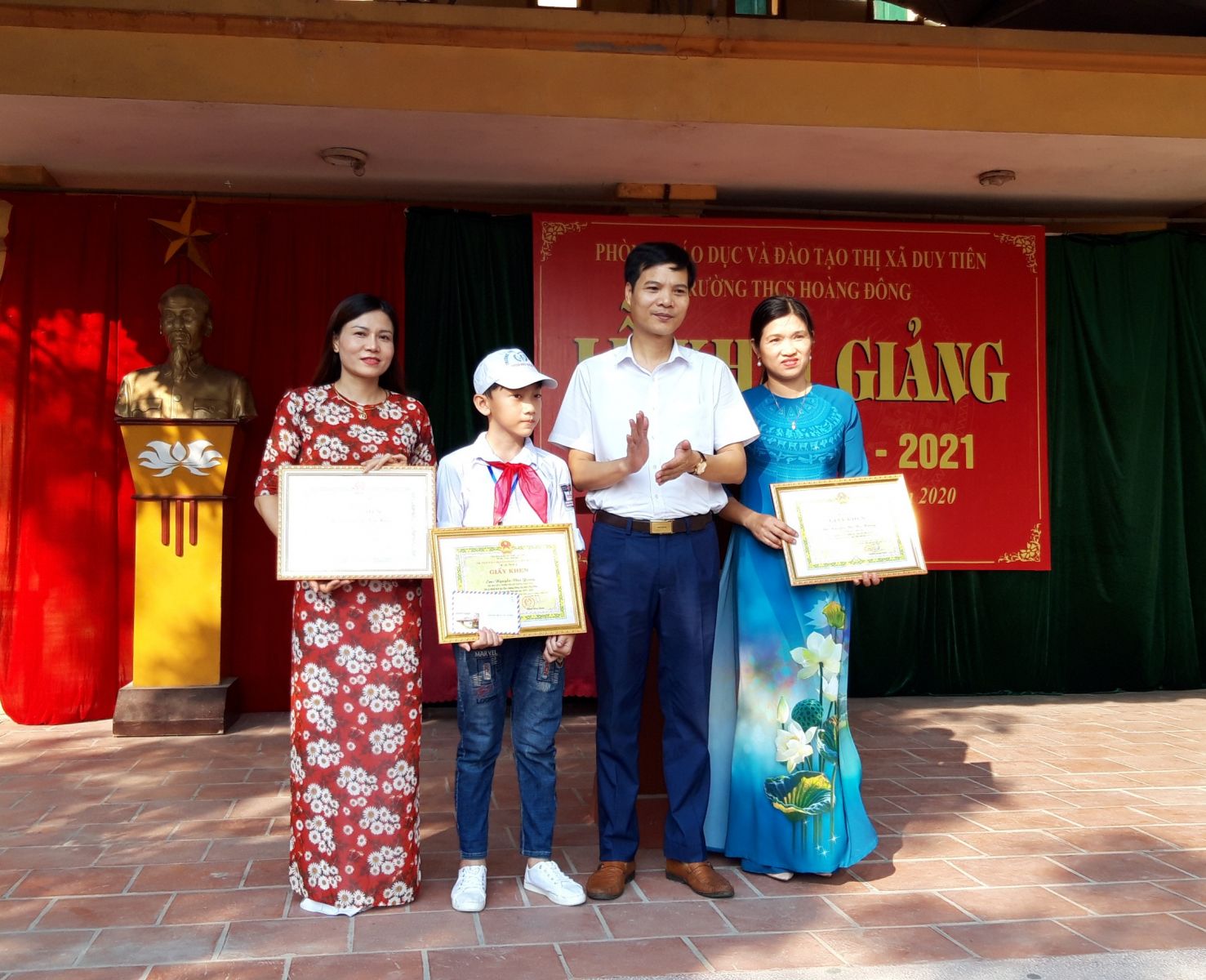 Cũng trong buổi lễ long trọng này, thay mặt cho thị ủy, HĐND, UBND thị xã Duy Tiên ông Vũ Kiên đã trao thưởng cho 2 cô giáo đạt thành tích xuất sắc trong công tác bồi dưỡng HSG văn hóa cấp tỉnh và học sinh giỏi TDTT cấp tỉnh năm học 2019-2020.
